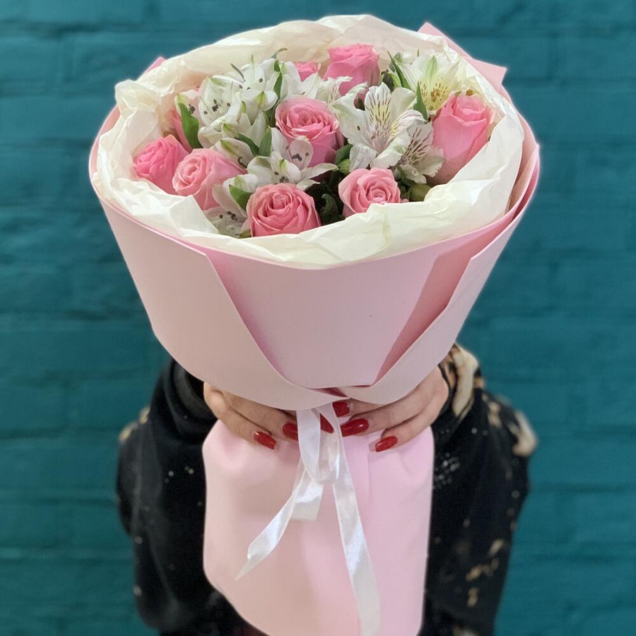 На фото букет «очарование чувств». В составе: роза 9 шт, альстромерия 3 шт, фоамиран 2 шт, атласная лента 1 шт, . Все цветы свежие и ароматные, букет красиво оформлен и отлично подходит для подарка. Доступна доставка цветов или самовывоз.